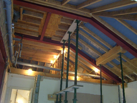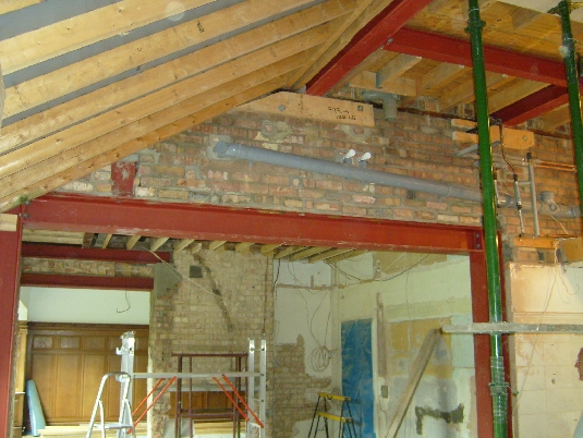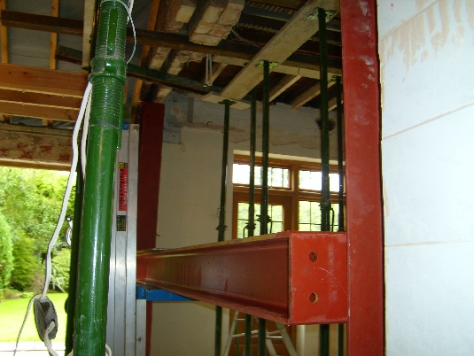Whilst supporting floor, erecting steel goalpost frame to take the weight of external walls.
